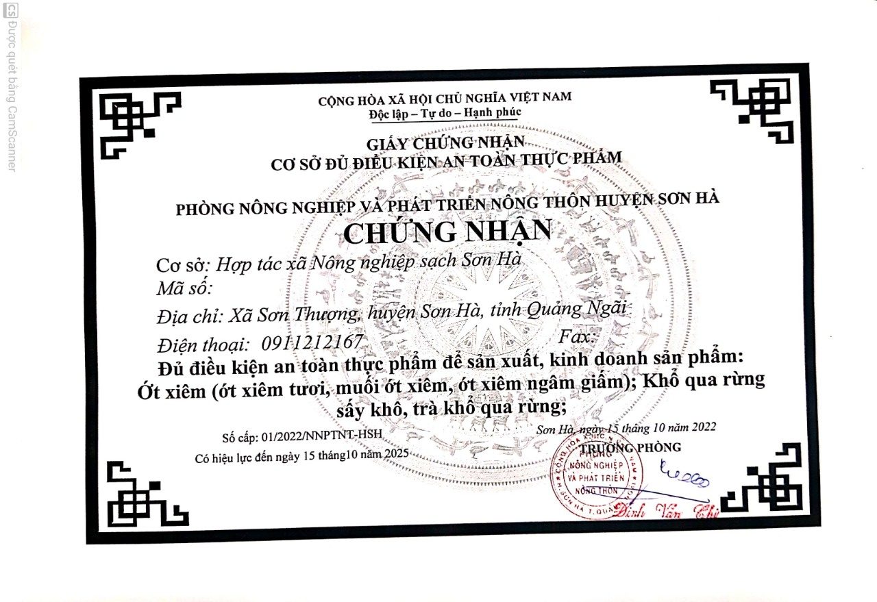 - Sản xuất tại: Hợp tác xã Nông nghiệp sạch Sơn Hà.